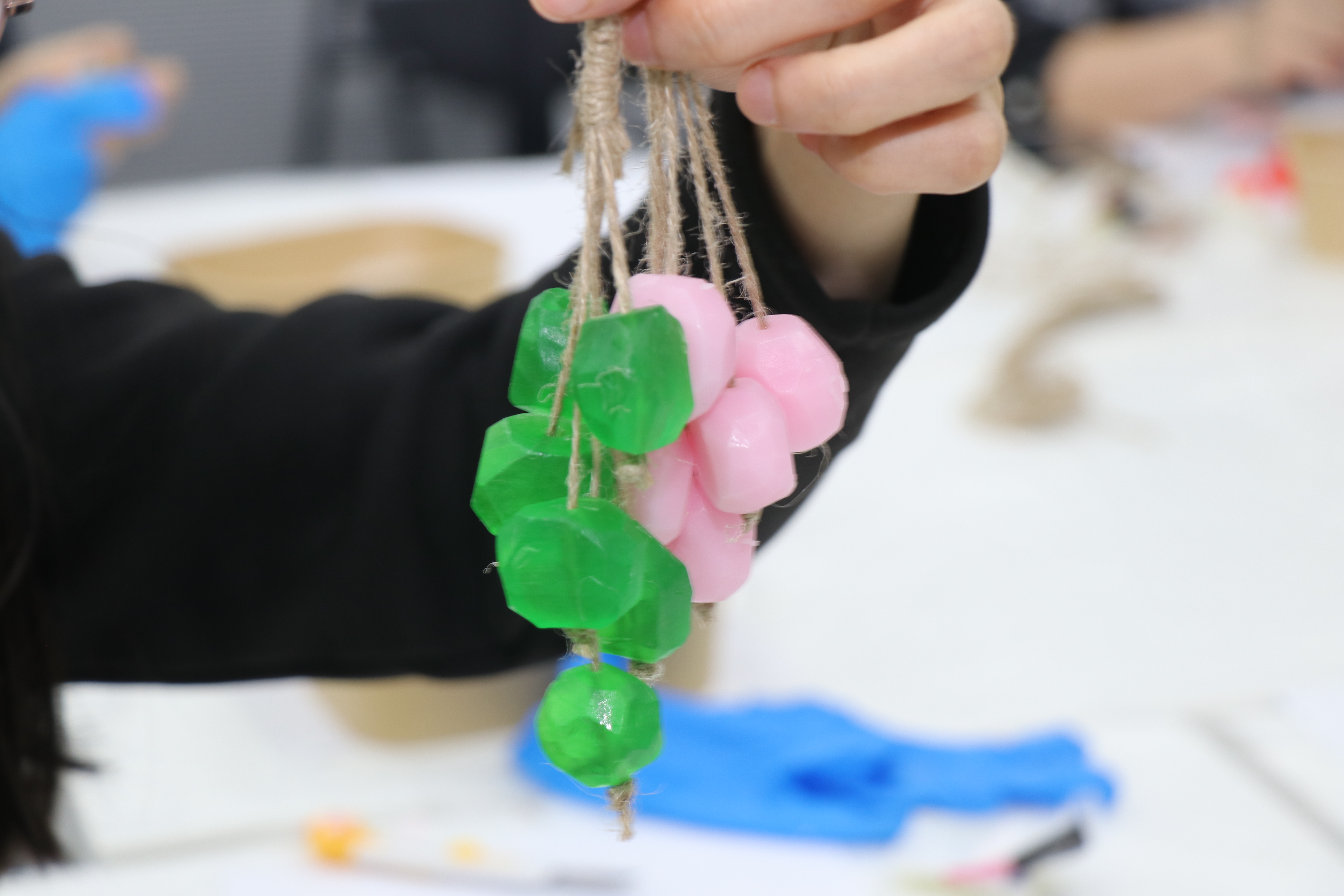 经过一个小时的精心制作,一串串造型别致、香气怡人的葡萄皂新鲜出炉,有简约大方的纯色皂,有层次分明的渐变皂,还有不同色彩搭配的文艺皂,每一串都独一无二,承载着大家的巧思与心意。大家小心翼翼地将自己的作品脱模、摆放整齐,纷纷拿出手机拍照打卡,记录下这份专属的节日回忆。