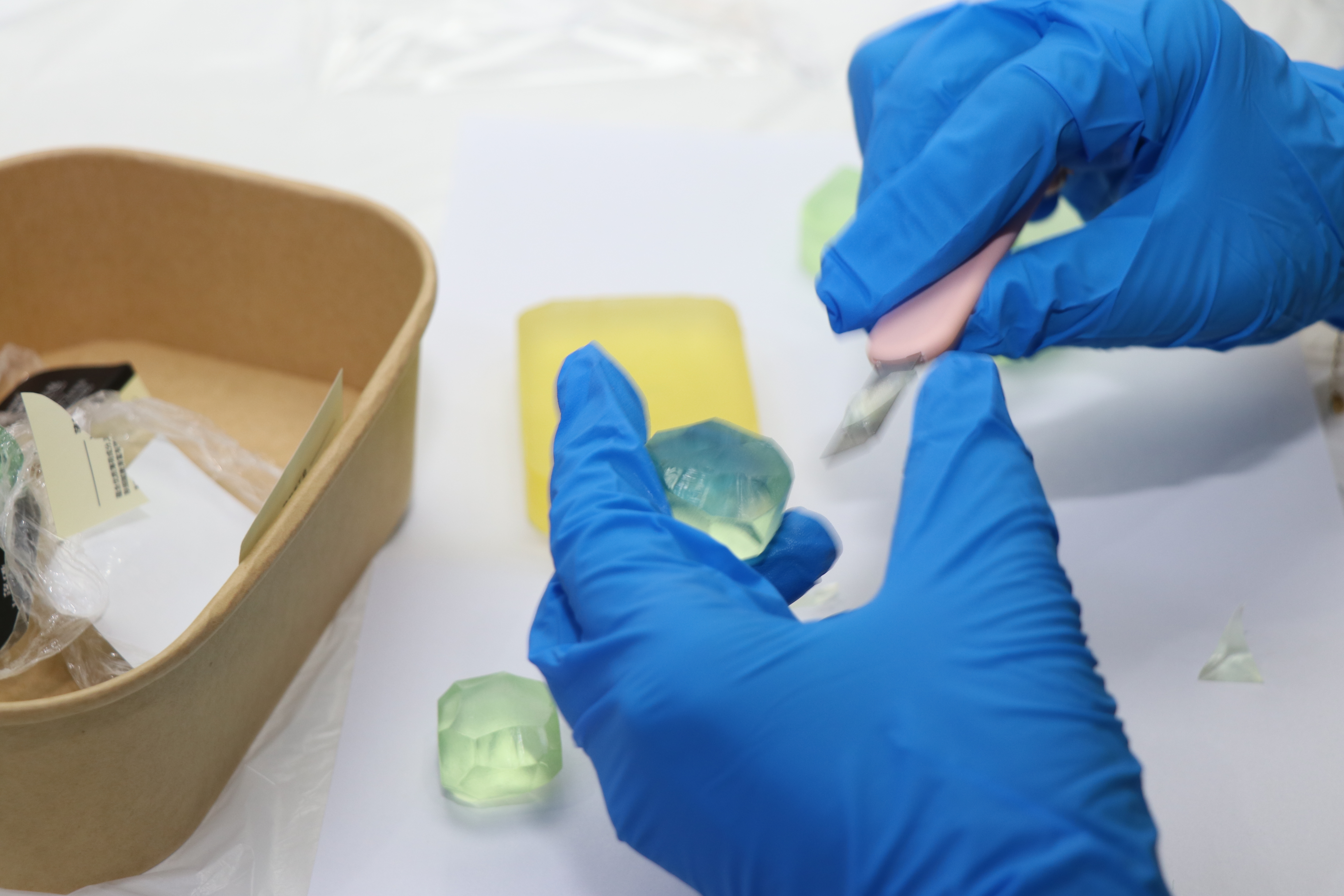 “平时都在忙着处理工作,很少有时间做这种手工活,今天能静下心来亲手做一块手工皂,感觉特别解压。”一位女职工一边切削,一边笑着说道。活动现场氛围十分热闹,大家围坐在一起,一边交流制作心得,一边分享工作和生活中的趣事,时不时传来阵阵欢声笑语。有的女职工专注地削出葡萄形状,力求做出最精致的造型;还有的拿着尺子精心测量,纠结着做哪种款式,每个人的脸上都洋溢着专注又幸福的笑容。